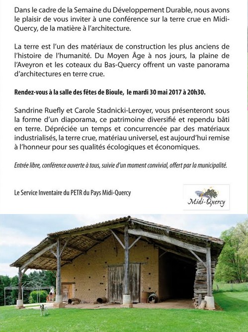 Le mardi 30 mai 2017, conférence à la salle des fêtes de Bioule sur la terre crue.