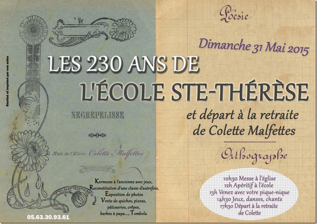 L’école Ste-Thérèse fête ses 230 ans et le départ à la retraite de Colette Malfettes le Dimanche 31 Mai 2015.