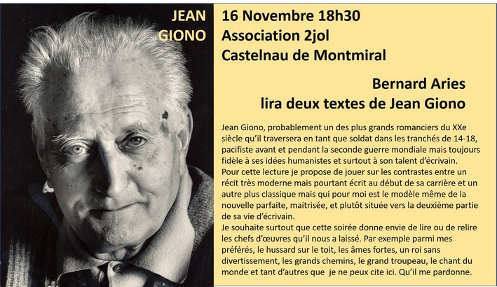L’association 2 jol etla médiathèque Charles Portal vous proposent une lecture de textes de GIONO par Bernard Ariès
