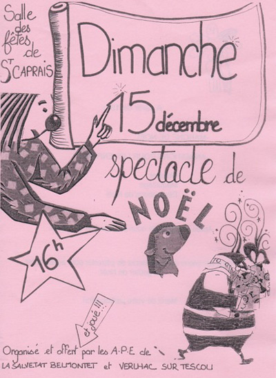 L’Association des Parents d’Élèves des Écoles de Verlhac-Tescou et de la Salvetat Belmontet organise un après midi de Noël Dimanche 15 Décembre 2013 à la Salle des Fêtes de Saint-Caprais.
