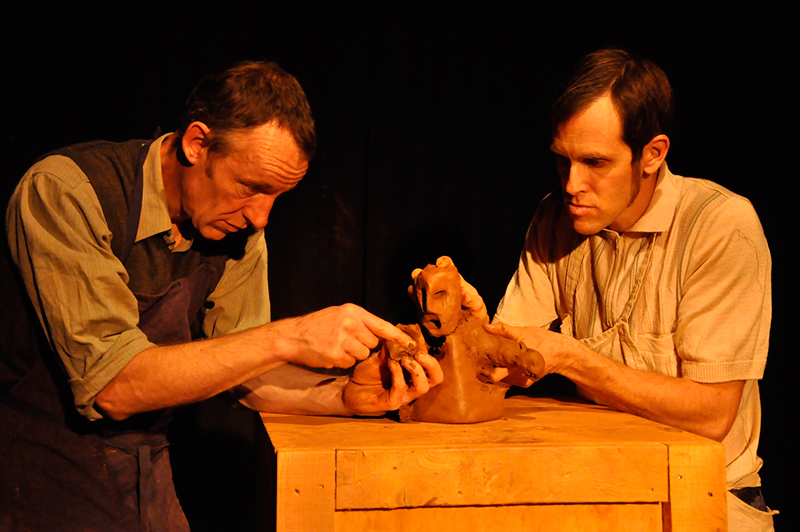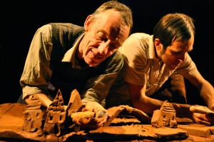 Sur scène, trois planches, trois caisses, trois mottes de terre et deux compères aux mains nues qui façonnent, en direct, un univers d’argile. Taillée, sculptée, battue, la terre s’anime en personnages et paysages éphémères. La campagne se modèle, les habitations se dressent, les usines se bâtissent et les villes s’érigent toujours plus haut grignotant l’espace jusqu’au dernier carré de terre. Et après ? Quel avenir pour notre planète ?