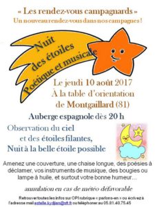 Pour cette rencontre en plein air, il sera utile de prévoir des couvertures ou des chaises longues, des bougies ou des lampes à huile ou de camping… et bien sûr comme à notre habitude chacun amène ses couverts et un plat sucré ou salé et/ou une boisson à partager !! Pour les plus romantiques d’entre nous, cette soirée sera l’occasion de déclamer des poèmes ou des chansons ou jouer quelques notes de musique sous les étoiles… amenez le nécessaire !