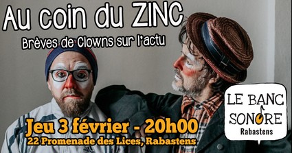 Accoudés au comptoir, deux clowns lisent des brèves et commentent l’actualité du moment. Il n’est pas sûr qu’ils comprennent tout, ni même que les informations retenues soient essentielles.