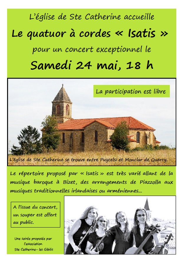 Samedi 24 mai 2025, à 18h., en l’église Sainte Catherine.La petite église de Sainte Catherine, entre Monclar de Quercy et Puycelsi, s’animera avec le quatuor Isatis