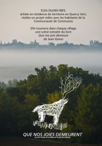 Elsa OLIARJ-INES, artiste en résidence de territoire en Quercy Vert, réalise un projet vidéo avec les habitants de la Communauté de Communes. Elle tourne dans chaque village une scène extraite du livre Que ma joie demeure de Jean Giono.