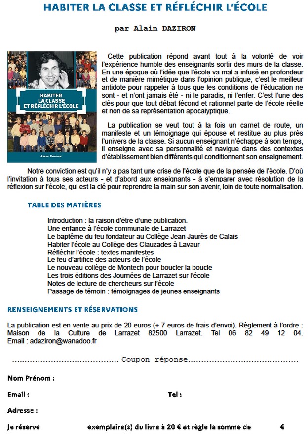 La publication « habiter la classe et réfléchir l’école » sera présentée et disponible le samedi 22 mars à partir de 14 H à Larrazet ( salle des fêtes) Elle sera suivie d’un débat animé par Philippe Meirieu et Philippe Champy ( programme en pièce jointe) L’entrée est libre et gratuite.