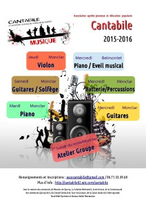 Les amateurs de guitares ont le choix entre le mercredi après-midi et le samedi matin, tous les styles sont permis! Mais encore Cantabile propose cette année un atelier de groupe multi-instrumets mensuel, destiné aux ados et adultes de niveau intermédiaire ou avancé. Le 1er lundi du mois de 19h a 21h à la salle de chat perché à Monclar, début le lundi 5octobre.