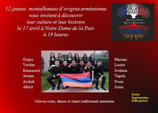 génocide Arménien , le vendredi 17 avril 2015 à partir de 19h00 à Notre Dame de la Paix, 5 rue Louis Braille à Montauban.