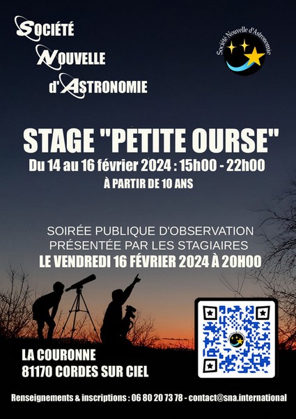 Du 14 au 16 février 2024, la formation « Petite Ourse » s’adresse aux jeunes de plus de 10 ans… Elle délivre l’autonomie nécessaire pour se repérer dans le ciel et retrouver les objets que l’on veut observer. À l’issue de la formation, on est également capable de mettre en œuvre un instrument d’observation astronomique.