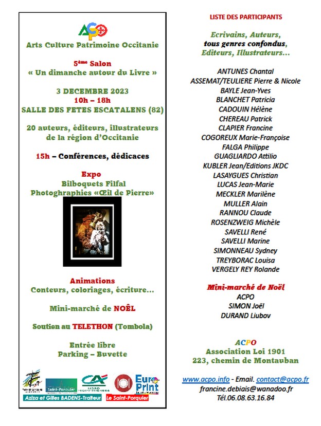 Les membres de l’association »Arts Culture Patrimoine Occitanie » ont le plaisir de vous inviter à l’inauguration du 5ème salon «UN DIMANCHE AUTOUR DU LIVRE» en présence des auteurs, écrivains, éditeurs, illustrateurs, tous genres confondus