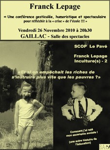 Le vendredi 26 novembre 2010 à 20h. 30, à GAILLAC Franck LEPAGE nous propose « Inculture 2 », une conférence gesticulée, humoristique et spectaculaire.