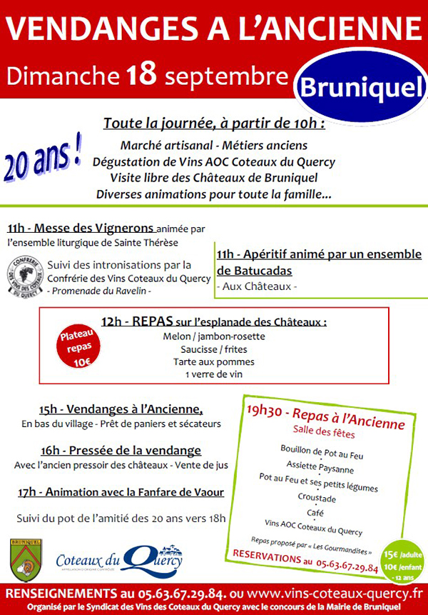 Toute la journée : marché artisanal, métiers anciens, dégustation des vins des Coteaux du Quercy, visite libre des Châteaux de Bruniquel, diverses animations pour toute la famille.