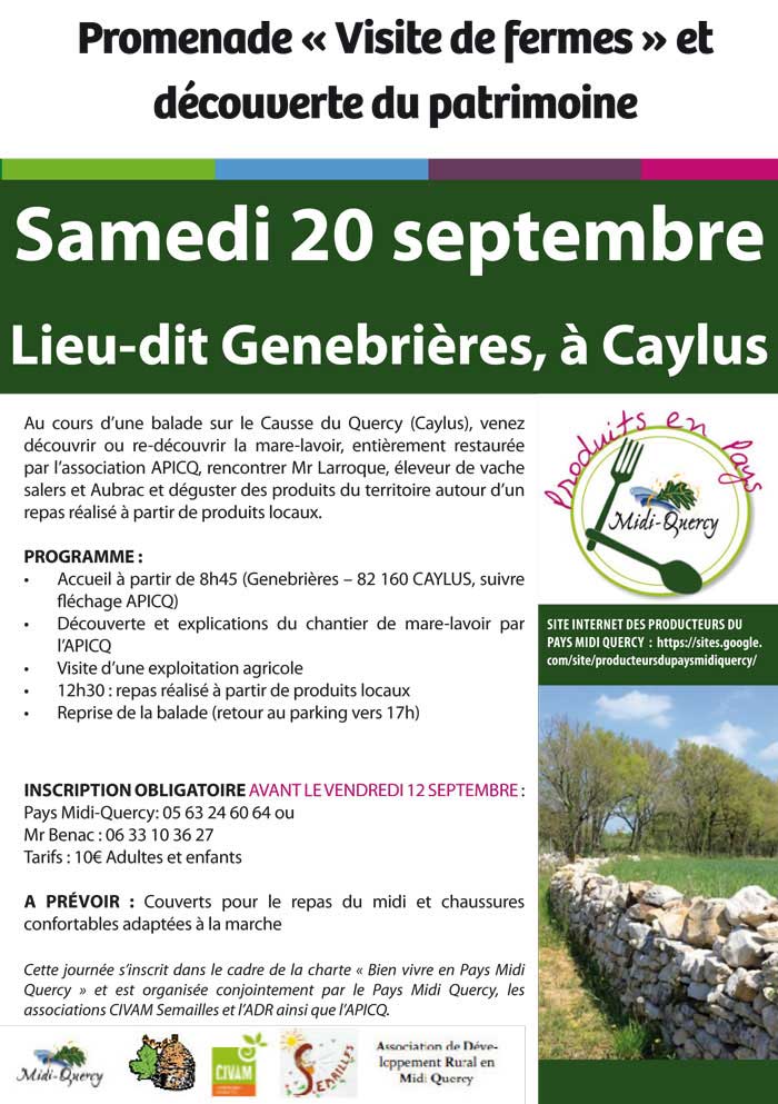 Le Pays Midi Quercy, les associations CIVAM Semailles et l’ADR ainsi que l’APICQ vous propose une promenade « Visite de fermes » et découverte du patrimoine le Samedi 20 Septembre 2014au Lieu-dit Genebrières, à Caylus.
