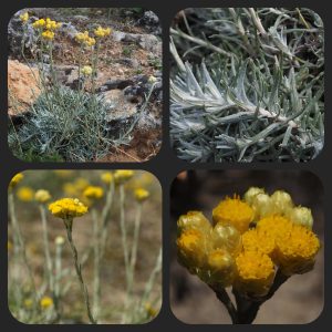 L’immortelle commune, Helichrysum stoechas, éclaire les coteaux pierreux de ses capitules dorés. Son feuillage argenté libère sous l’ardeur du soleil une fragrance chaude et épicée rappelant le curry. Même fanée elle garde son éclat, fidèle à son nom d’ « immortelle ».