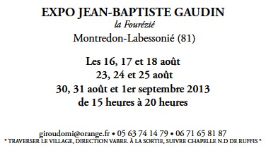 Jean-Baptiste Gaudin, peintre , sculpteur. 1971 / 2011. Domi Giroud et ses amis proposent une exposition qui rassemble une grande partie de ses œuvres picturales les trois derniers week-ends du mois d’août 2013 à Montredon-Labessonnié.