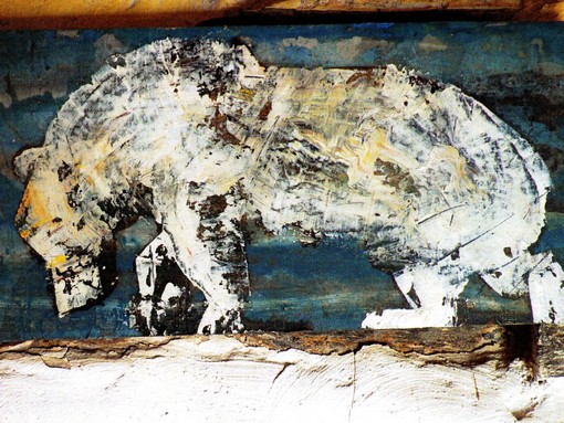 Jean-Baptiste aime mélanger les matières (huile, acrylique, craie, encre, crayon de couleur…) et n’importe quel support récupéré peut servir : jute, bout de laiton, papier, ancienne affiche, carton, sac d’emballage, morceau de bois…