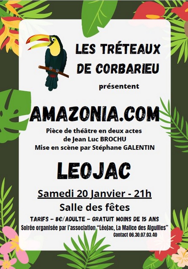 L’association Léojac La Malice des Aiguilles organise une soirée théâtre à Léojac le 20 janvier 2024 à 21h. Les Tréteaux de Corbarieu présentent Amazonia.com, une pièce de Jean-Luc Brochu avec une mise en scène de Stéphane Galentin.