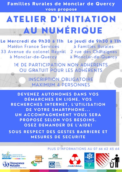 - le mercredi de 9h30 à 11h à Maison France Services (anciennement MSAP en face du Crédit Agricole à Monclar de Quercy)