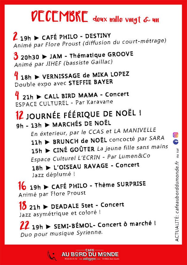 Au bord du Monde » … à Salvagnac (81) Loisirs, Vie Pratique, Salvagnac, N° 189 - Décembre 2021 Programme de décembre 2021 Information communiquée par Yvan Partager : Cliquer pour envoyer un lien par e-mail à un ami(ouvre dans une nouvelle fenêtre) E-mail Cliquez pour partager sur Facebook(ouvre dans une nouvelle fenêtre) Facebook Cliquez pour partager sur WhatsApp(ouvre dans une nouvelle fenêtre) WhatsApp J’aime ça :J’aime chargement… Similaire SalvagnacprogrammeCafé au bord du mondedécembre 2021