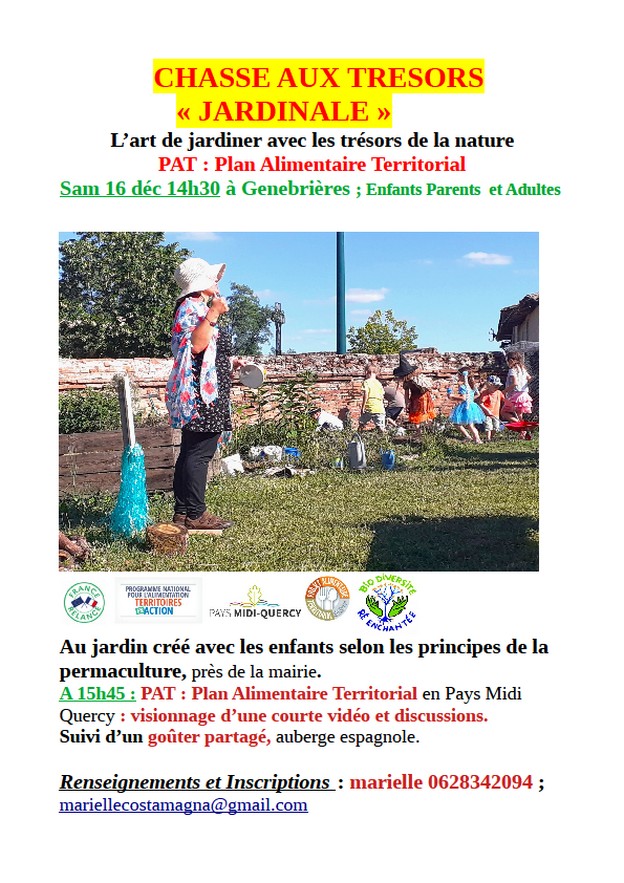 L’association Biodiversité Ré enchantée vous convie: Bienvenue à genebrières ce samedi 16 décembre à 14h30 pour notre chasse aux trésors « jardinale ». Nous célébrerons le PAT: Plan Alimentaire territorial