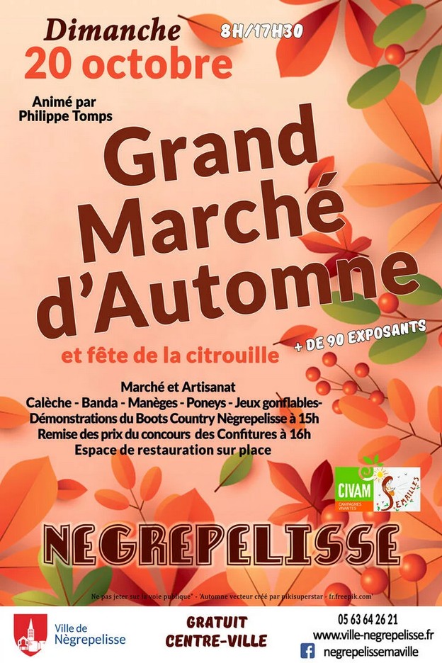 Grand marché d’automne… à Nègrepelisse (82) Parlons-en !, A côté de chez nous, Vie Pratique, N° 223 - Octobre 2024 20 octobre 2024 de 8h00 à 17h30 Planifié ical Google outlook Parlons-en ! A côté de chez nous Vie Pratique N° 223 - Octobre 2024 Nègrepelisse dans le village Carte Dimanche 20 octobre 2024, de 8h. à17h.30, dans le village. Information communiquée par Aurore DEFFRENE Retrouvez tous les événements dans l’agenda ! Partager : Cliquer pour envoyer un lien par e-mail à un ami(ouvre dans une nouvelle fenêtre) E-mail Cliquez pour partager sur Facebook(ouvre dans une nouvelle fenêtre) Facebook Cliquez pour partager sur WhatsApp(ouvre dans une nouvelle fenêtre) WhatsApp J’aime ça :J’aime chargement… Similaire Nègrepelissegrand marché d'automneS4124