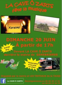 La Cave Ô Zarts fête la musique DIMANCHE 20 JUIN à Genébrières, à partir de 17h, jusqu’à 21h30: vous pourrez vous restaurer sur place et une buvette sera mise à disposition. . Une solution de repli en intérieur est prévue en cas de pluie et les mesures relatives aux gestes barrière seront respectées.