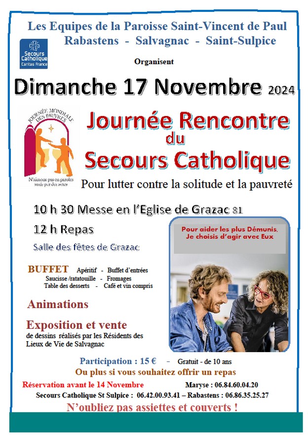 Rencontre du Secours Catholique…à Grazac (81) Parlons-en !, A côté de chez nous, Solidarité, Vie Pratique, N° 224 - Novembre 2024 17 novembre 2024 de 10h30 à 17h30 Planifié ical Google outlook Parlons-en ! A côté de chez nous Solidarité Vie Pratique N° 224 - Novembre 2024 Grazac 81800 Carte Dimanche 17 novembre 2024, église et salle des fêtes. Information communiquée par Georgette GAMBAZZA Retrouvez tous les événements dans l’agenda ! Partager : Cliquer pour envoyer un lien par e-mail à un ami(ouvre dans une nouvelle fenêtre) E-mail Cliquez pour partager sur Facebook(ouvre dans une nouvelle fenêtre) Facebook Cliquez pour partager sur WhatsApp(ouvre dans une nouvelle fenêtre) WhatsApp J’aime ça :J’aime chargement… Similaire rencontreGrazacmesseSecours CatholiqueS4624repas