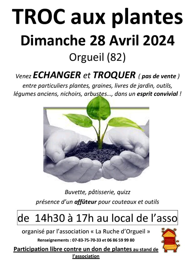 ATTENTION : Cette année le Troc se déroulera au local de la ruche, pétanque et bibliothèque d’Orgueil, route de Planques (à côté du Carrettou provisoire) au centtre du villagebdirection Fronton.