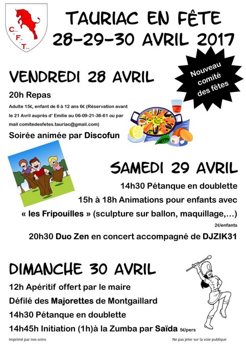 Le nouveau comité des fêtes de Tauriac vous invite à venir faire la fête les 28, 29 et 30avril 2017. Dates à retenir et repas à réserver!