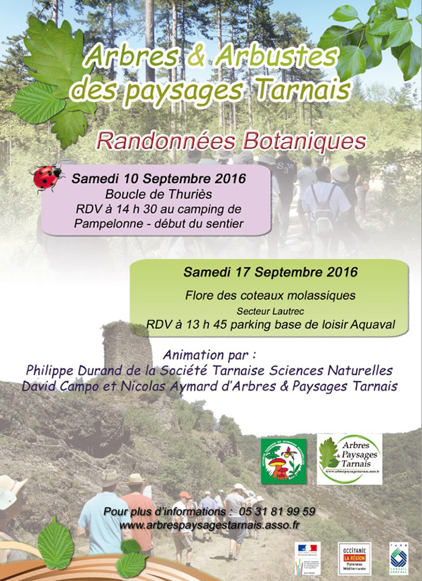 Dans le cadre des journées nature de la Région Occitanie, l’association Arbres et Paysages Tarnais vous propose 2 sorties les Samedi 10 Septembre 2016, à 14h30 au camping de Pampelonne et Samedi 17 Septembre 2016 à 13h45 à Lautrec.
