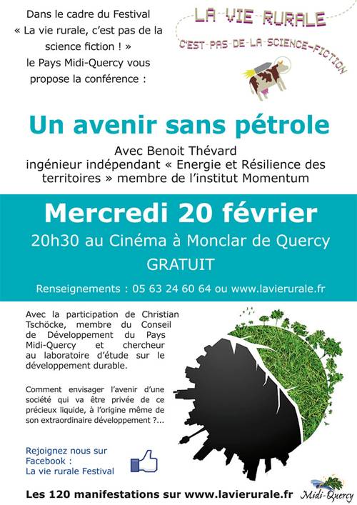 Le Pays Midi-Quercy vous invite le mercredi 20 février 2012 au Cinéma de Monclar de Quercy à 20h30 pour une conférence : « Un avenir sans pétrole » proposée par Benoit Thévard, ingénieur indépendant « Energie et Résilience des territoires », membre de l’Institut Momentum avec la participation de Christian Tschöcke, membre du Conseil de Développement du Pays Midi-Quercy et chercheur au laboratoire d’étude sur le développement durable.